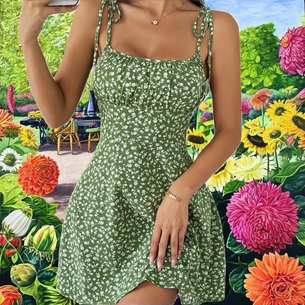 Customize 2025 Summer New Arrival Square Collar Plain Dyed Satin Sweet Waist Floral A-line Mini Dress Loose Fit Casual Day